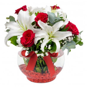 2.277,50 TLAynı Gün Ücretsiz TeslimatCam Vazoda Kırmızı Gül ve Beyaz Lilyum 7 adet Kırmızı Gül